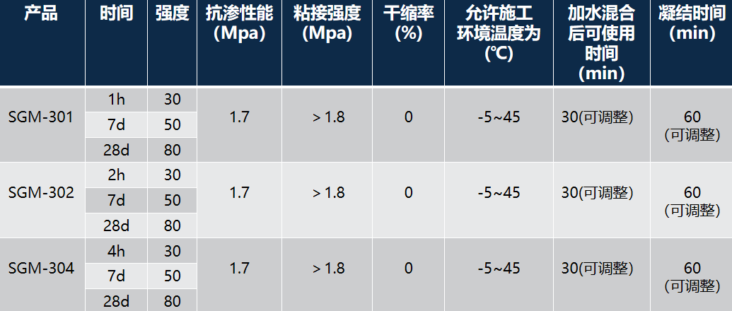 2、早强:15分钟左右即可凝固,1小时即可投入使用。(在适宜的施工温度下,1小时强度达到C30,7天强度达到C50以上);