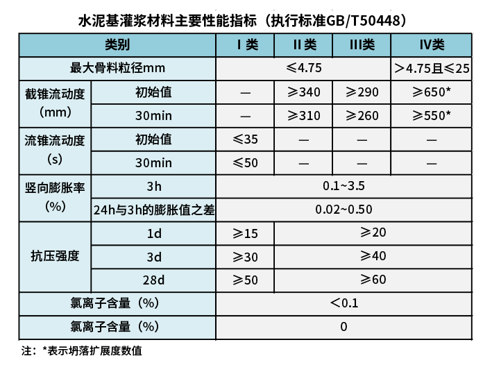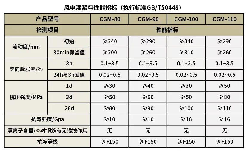 风电灌浆料参照GB/T50448《水泥基灌浆材料应用技术规范》,性能指标如下: