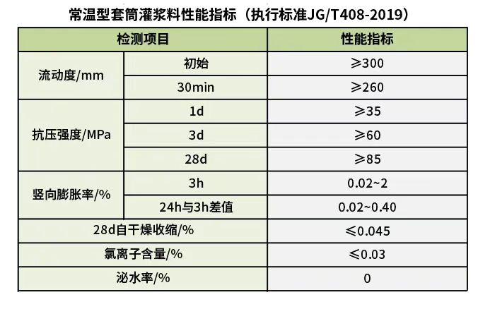 钢筋连接用套筒灌浆料的执行标准为JG/T408-2019《钢筋连接用套筒灌浆料》,技术参数要求如下: